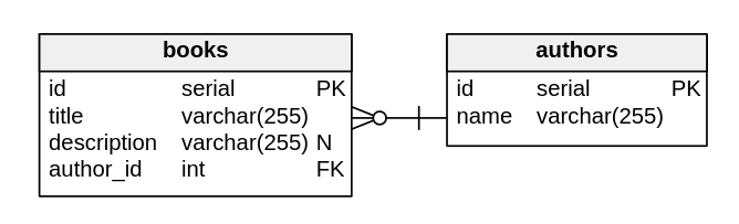 Let's assume that a book must have an author. An author may have one or multiple books. Hence, we call a relationship from authors to books as "one-to-many". Therefore, we could model the data as shown in figure 2. From figure 2, the "books" table have a column called "author_id" which links to the "authors" table's "id" field. That indicates that a book may have one and only one author. On the other hand, "authors" may have one or multiple books.